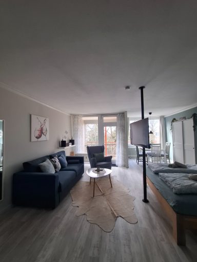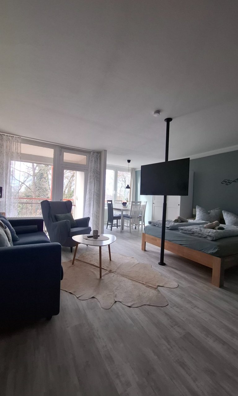 Die liebevoll im maritimen Stil eingerichtete Unterkunft bietet gemütliche Sitzmöglichkeiten und seitlichen Seeblick. Dank der südwestlichen Ausrichtung ist das Studio sonnendurchflutet und schafft eine helle, einladende Atmosphäre. Die voll ausgestattete Küche lädt zum gemeinsamen Kochen ein, während der 180°-schwenkbare Fernseher flexible Unterhaltung aus jeder Position ermöglicht.